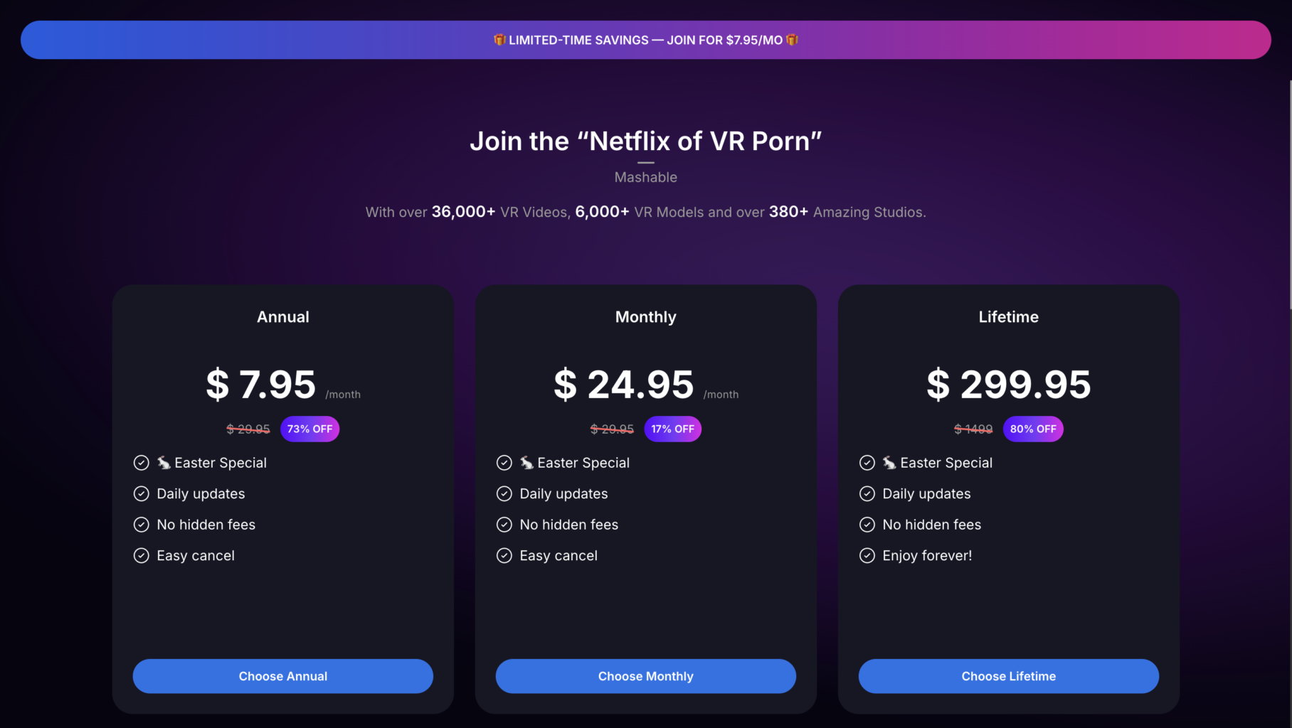Dans une approche plus flexible, l’abonnement mensuel passe à 24,95 dollars avec une réduction d’environ 17 %. C’est l’option à privilégier si vous voulez tester la plateforme sur une courte durée. La formule à vie attire davantage l’attention avec un tarif de 299,95 dollars au lieu de 1499 dollars. Avec une remise de 80 %, il s’agit du meilleur bon plan VRPorn.