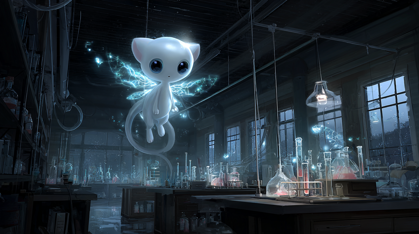 Dans l’univers Pokémon, les scientifiques ont créé Mewtwo en manipulant génétiquement l’ADN de Mew. Ironiquement, Mew fut ajouté aux jeux originaux en secret par les développeurs après que le débogage fut terminé, utilisant l’espace mémoire libéré. Ce mystère entourant son existence a contribué à sa popularité légendaire